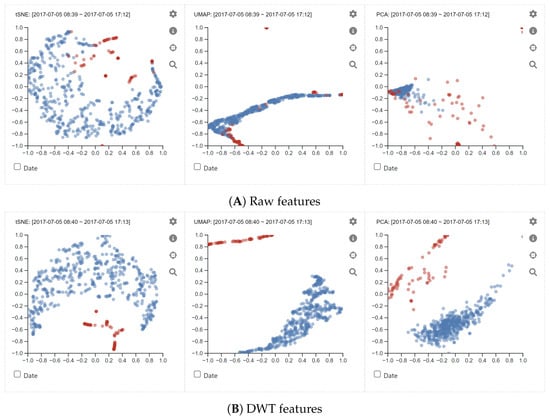 Since the system utilizes the raw and DWT features for analyzing network events, it is vital to determine the effectiveness of using the DWT features compared to using the raw features. Figure 9 shows examples of scatterplots of network traffic events on Day-3 using (A) raw and (B) DWT features. The used DWT features include standard deviation, median, and energy of the feature (“Flow Duration”). When using the raw features, the scatterplots with UMAP and PCA did not provide distinctive differences between normal and strange events. However, with t-SNE, we found that some abnormal events were positioned nearby. However, when using the DWT features, we observed improved projections of normal and abnormal events. Specifically, t-SNE and PCA showed better representations of network events indicating the difference between normal and abnormal.