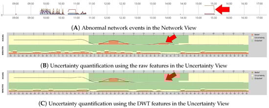 We proposed an interactive web-based visualization system to help users analyze network traffic data. Instead of using raw feature data, DWT-based feature extraction is applied as an alternative method to identify hidden but critical information from the network traffic and eventually help users determine abnormal network patterns. The DWT features (i.e., ) presenting rapid changes and coarse approximation of network events in a time domain are extracted. Figure 10 shows examples of subjective opinions on the (A) raw and (B) DWT features of Day-3 network traffic data in the Uncertainty View. On Day-3, two types of attacks were embedded into the CICIDS2017 dataset as DoS/DDoS (9:47 a.m.–11:23 a.m.) and Heartbleed on port 444 (15:12 p.m.–15:32 p.m.). The arrows in the figure indicate the regions where the Heartbleed attacks were embedded. As shown in Figure 10B, the Heartbleed attacks (see the arrow in the figure) are clearly visible, indicating a belief probability of having abnormal events. However, the attacks are disappeared when utilizing the DWT features (see Figure 10C). Although the Heartbleed attacks generate high burst attacks (see Figure 10A) that can be easily detected with the DWT features, we identified that a single network event (indicating a Heartbleed attack) occurred every two minutes starting from 15:12 p.m. Because of such fewer attack events, applying DWT to extract features from such events may not be feasible. Interestingly, we found a possibility of detecting outliers by analyzing the difference between the two representations (Figure 10B,C) as comparing two outcomes is often utilized in detecting possible outliers [18]. Since finding possible outliers in network traffic data analysis is important, we plan to upgrade our system by adding a technique that supports comparing multiple results.