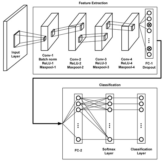 Table A1 shows the parameters description of CNN layers, where is filter size, is the number of filters (number of output feature maps), is stride, is padding, is the number of channels (number of input feature maps), a total of parameters is number of weights plus number of biases; in batch normalization is epsilon, is sifted, is scale, is the total number of parameters in a convolutional layer, and bias b = 1:
