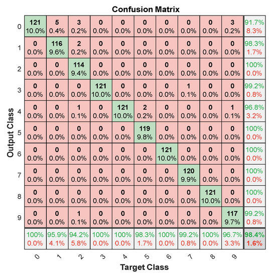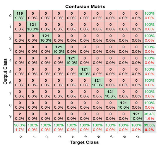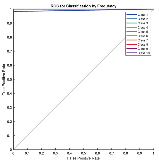The dataset was created after converting signals into 2D, containing ten folders and the name folder is the label, each representing one class. Each class has an IF and an LCR. The number of samples in each class equals the number of GSNR samples multiplied by the number of realizations , which equals . The total number of samples in the dataset equals the number of samples in each class multiplied by the number of classes . The target or true label of samples denotes which represents the number of frequencies and slopes. The dataset is randomly divided into 80% for the training set, 10% for the validation set, and 10% for the testing set, where Algorithm 2 illustrates the dataset divided, where noisy LFM signals dataset denoted and labels denoted by .