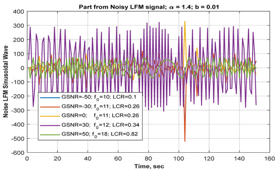 A nonstationary signal is one with a changing frequency content over time. This work is based on LFM signals influenced by noise (AWGN and SSN). requires four parameters The most critical parameters are the tail index and scale of the distribution , while the less essential parameters are . Gaussian noise is fixed power, and noise is geometric power.
