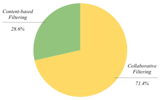 The distribution of the considered method for this review is shown in Figure 1, which provides a general snapshot of how the examined approaches can be related more to the collaborative or content-based filtering paradigms. Even if some of the techniques are generally or loosely related to one of the two filtering classes, we have tried to associate them with one of them.