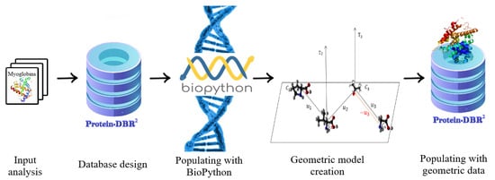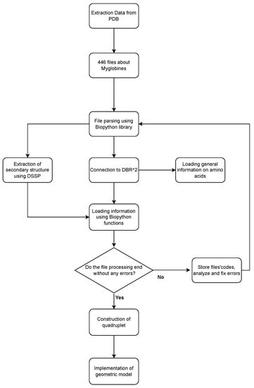In a general overview of the work done, the collection of the initial data and the careful study of these constitute the most important starting point. In this case study, information comes from the same source, the PDB. It was decided to focus on a particular biological family of proteins: the myoglobins. The initial design phase produces a conceptual schema, implemented in the form of a physical schema. The first population is based on data extraction from PDB files, using the Python library called BioPython. Then, an appropriate geometric model is constructed to describe the spatial properties of the protein primary sequence. Using this model, data are manipulated to proceed with a second population. Figure 2 illustrates these steps.