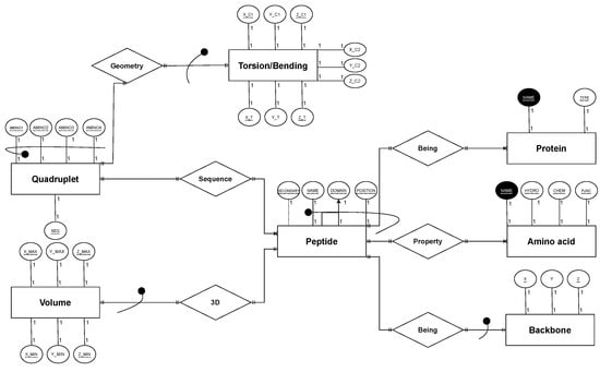 It shows a principal entity (Peptide) related to another six entities, four of these introducing geometric properties and mathematical models—these properties are fully described in [] (Volume, Quadruplet, Torsion/Bending and Backbone)—and the other two describing amino acids’ properties (Protein and Amino acid).