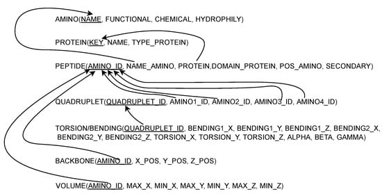 As already mentioned, population starts with the selection of the PDB files, available online at https://www.rcsb.org/ (accessed on 13 December 2022). As previously mentioned, the selection considers 446 Myoglobin proteins, and they are parsed one by one through the BioPython library. Thus, protein secondary structures are extracted from PDB files. Once all the information has been collected, they are inserted in the DBR2. The information of interest is extracted to populate all the tables: Protein, Peptide, Backbone, Volume and Quadruplet. The remaining table Torsion/Bending is populated through several queries and calculations returning the geometrical parameter values. All these issues are addressed using the tool described earlier, following the schema described in Figure 5. This phase required a great effort and it is necessary to pursue the goal of the paper; since the data as initially presented in PDB show a lot of information that is not useful for our purposes and are not well interconnected to each other, it is not possible to easily manipulate them and represent the geometric model formulated. Therefore, it is necessary to use a software to simplify the manipulation of the data and the construction of the datasets for the analysis.