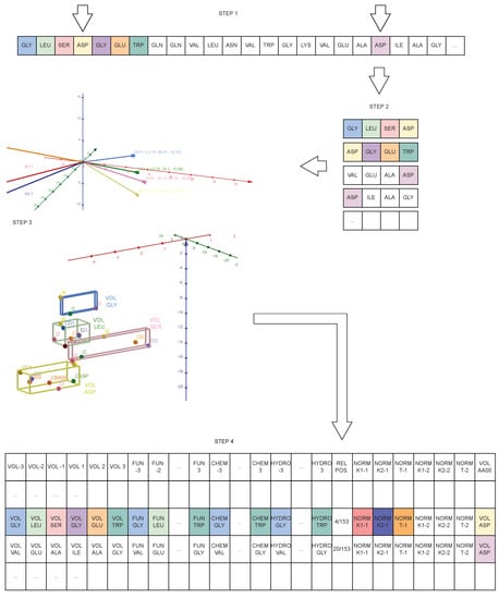 At a later stage, the dataset is extended considering also the properties of the amino acids that reside in AA0, comprising six and then nine residues that precede and follow it. To better clarify which are the features selected, how they have been processed and what is their geometrical meaning, it is possible to analyze the following schema Figure 6. Here is shown, as an example, what the steps are that allow one to populate the CSV file for the analyses. In this example, the amino acid Aspartic Acid (ASP) was considered in all the primary structures loaded in DBR2. In particular, during STEP 1, the algorithm will detect its presence in the protein PDB code: 3HEN Listing 1, in position 4/153, 20/153 and so on. Then, in STEP 2, for each of these occurrences, the algorithm will also detect the two quadruplets—i.e., those in which ASP is in first and last position—and subsequently, during STEP 3, it will extract the geometrical features—according to the model presented in []—and the biological ones. Finally, in STEP 4, for every occurrence of ASP, a row, including all the information extracted, will be added to the CSV file.
