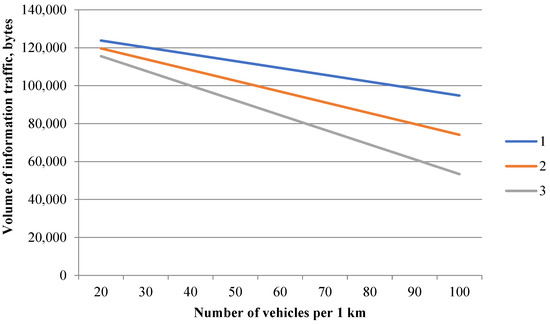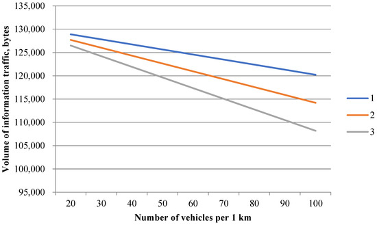 Dependence of the traffic volume available for transmitting information on the number of OBUs per 1 km (1, 2, and 3—confidentiality levels).