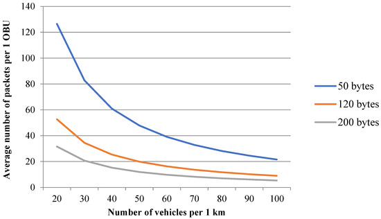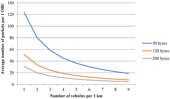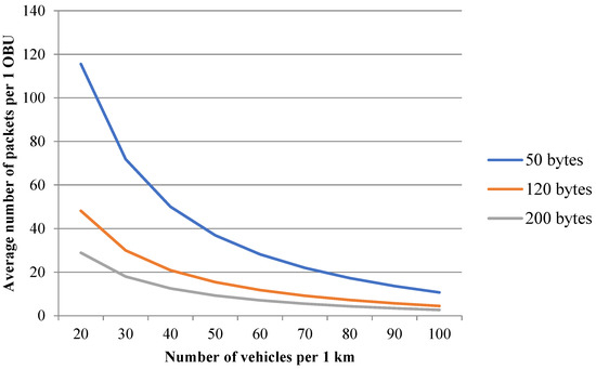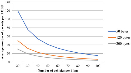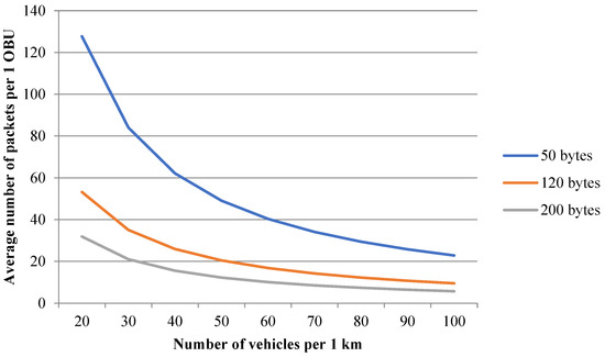 Figure 2 analysis shows that using shorter packets allowed increasing their average value per OBU. So, with small traffic density up to 20 OBUs per 1 km, with a packet size of 50 bytes, there were up to 126 packages per OBU. If the packet size was 120 bytes, then the number of packets was reduced to 52.