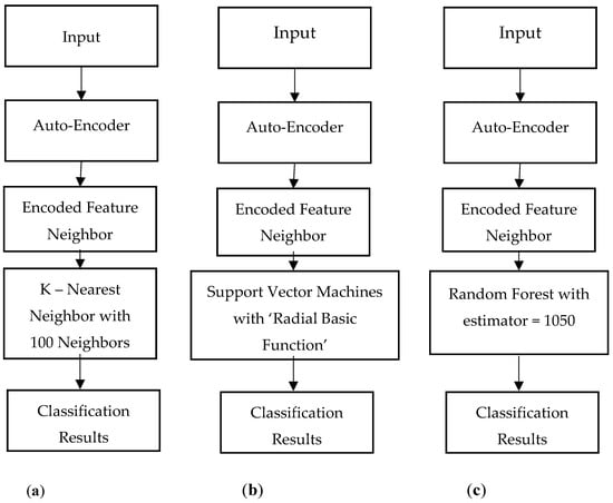 Flow chart of the proposed algorithm. (a) Autoencoder and KNN. (b) Autoencoder and SVM. (c) Autoencoder and RF.