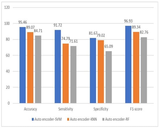 Table 5 depicts improvement in the percentage of performance parameters by comparing the proposed algorithm with other chosen algorithms. It is observable that the proposed algorithm Auto-Encoder-SVM is 7.17413% more accurate than Auto-Encoder-KNN, and 12.6904% more accurate than Auto-Encoder-RF. When compared with the sensitivity proposed algorithm Auto-Encoder-SVM has 22.6367% more sensitivity than Auto-Encoder-KNN and 28.0827 more accuracies than Auto-Encoder-RF. It is also observed from the last column, a specificity that the proposed algorithm has 3.35358% less specificity than the proposed algorithm Auto-Encoder-SVM, and 25.4724% less specificity than the proposed Auto-Encoder-SVM algorithm. From all the above evaluations, it has been determined that the algorithm being proposed, Auto-Encoder-SVM is more accurate and effective than other algorithms.