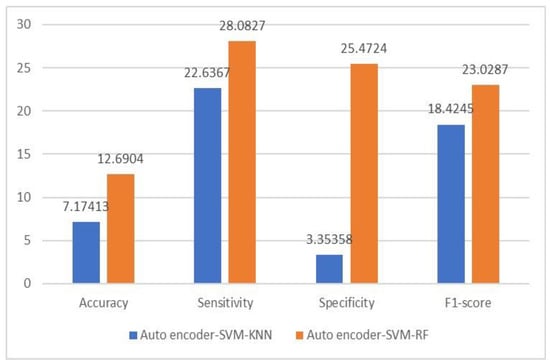 The comparison of the selected algorithms’ performance metrics with the suggested algorithm is shown in Figure 4. The improvement in accuracy for the SVM with KNN is shown to be smaller, at 7.17413, than for the SVM plus RF, at 12.6904. As a result, in terms of accuracy, the KNN method is more similar to the suggested approach. In terms of sensitivity, KNN is 22.6367 and RF is 28.0827; as a result, KNN differs more from the suggested method in terms of improvement. In terms of specificity, KNN and the proposed algorithm are very similar (3.35358), whereas there are significant differences (25.4724 and 23.0287, respectively) between the RF algorithm and the proposed algorithm in terms of specificity. Lastly, KNN and the proposed algorithm differ less in terms of the F1-score (18.4245 vs. 23.0287).
