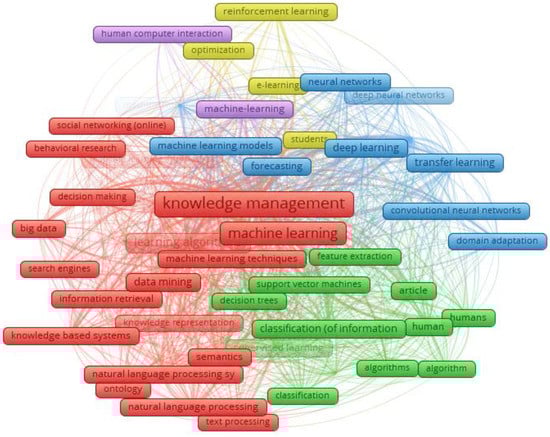 The second largest cluster is the green one, which covers topics such as feature extraction, support vector machines, decision trees, humans, algorithms, information categorization, and supervised learning. Topics such as domain adaptability, convolutional neural networks, transfer learning, deep learning, forecasting, machine learning models, and neural networks are discussed in the blue cluster, which is the third largest. The yellow cluster shows a discussion on e-learning, students, and reinforcement learning, while the purple colour describes machine learning in terms of human–computer interaction. According to the findings, computer science and engineering dominate the majority of machine learning and knowledge management research. The application of KM and ML in commercial and organisational environments has not been exhaustively explored.