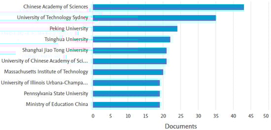 Figure 3 shows the top 10 research institutions that have conducted the most research on the themes of “machine learning” AND “knowledge management”. There are seven Chinese institutions that are most keen on conducting research on ML and KM, such as the Chinese Academy of Science, Peking University, Tsinghua University, and several other institutions, including the Ministry of Education of China. The second-largest country in these terms is the USA, followed by Australia.