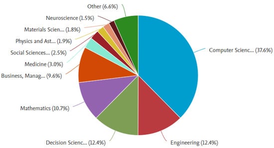 Figure 4 shows the distribution of subject areas that discuss “machine learning” and “knowledge management”. The largest portion, 38%, comes from computer science; engineering and decision science each contribute 12%. Mathematics accounted for 11% of all publications, whereas business management accounted for 10%.