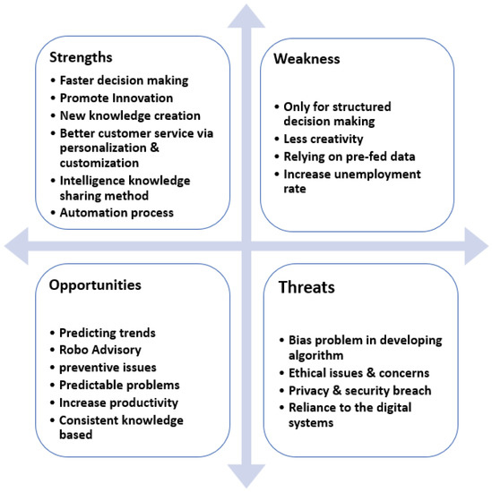 The weakness of KM with ML enabled is that decisions can only be made through structured decision-making. ML cannot provide decisions for complex problems. This is where human beings excel; their creativity and experience make them superior at creating and making complex decisions [77]. Meanwhile, KM with ML enabled is only able to make decisions based on previously provided data or data that are already available. The opportunities of KM and ML are the advantages of predicting trends and patterns based on available data. Then, it is possible to identify problems before they occur, making it possible to increase maximum productivity. Finally, threats that may occur are biases created in the algorithm to subjectively identify certain groups [78]. Then, of course, there are threats to data security and privacy as well as ethical issues that might arise in the use of user data.