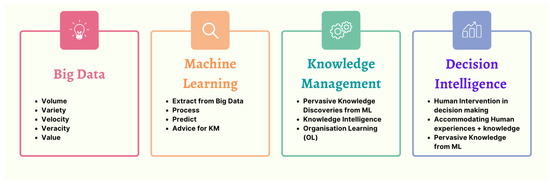 Finally, decision intelligence (DI) is the product or outcome of implementing KM using ML. Decision intelligence equips organisations with the tools necessary to use ML and big data to manage their knowledge and make rapid, precise, and consistent decisions [88]. It must be highlighted that decision intelligence is not solely an outcome of machine learning recommendations. However, the decision-making process combines input from human experiences and machine learning recommendations.