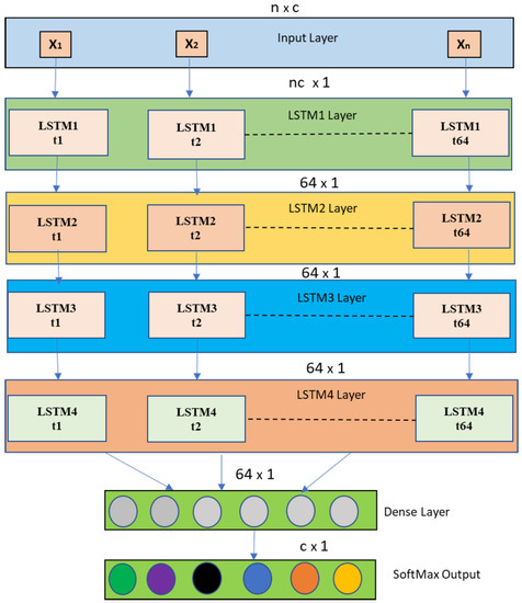 A standard LSTM memory cell contains input, output, and forget gates. Read and write access to the cell is controlled by an input gate and output gate. The cell reset is handled by forget gate. These cells are the building blocks of the LSTM layer. Figure 1 illustrates all the layers, input, and output shapes of the layers in the proposed LSTM architecture. It contains 4 LSTM layers with 64 units, and four dropout layers to process the input dataset with n records and c features. The last dropout layer output is fed into the dense layer. The dense layer is a densely connected layer in which every neuron is connected to all the neurons in the previous layer. This layer helps to change the dimensions and also does not lose the learning information from the previous layers. The dense layer connected to the last dropout layer has five neurons representing the network attack types. Finally, softmax is used for multiclass classification of the outputs. This model is also applied for binary classification of attacks by changing the last layer to use function.