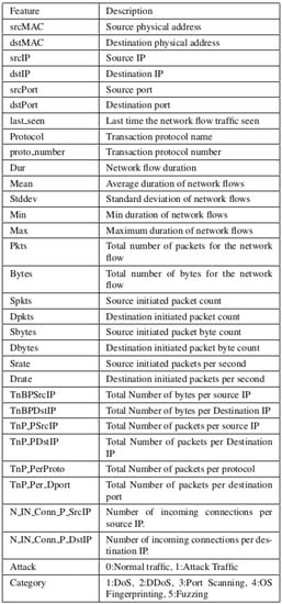 Two SDN environment-specific data sets were considered to perform the experiments and evaluate the proposed LSTM approach. The first dataset, named “DS1”, is extensively used to determine various deep learning models performance for classifying the network attacks in the SDN-based IoT network. The dataset DS1 contains the binary labeled data for attack detection and multiclass labeled data for network attacks classification. The DS1 dataset contains 33 features, and each record in the dataset represents the network connection stats along with attack classification label. The feature details of the DS1 are shown in Figure 2. Most of these features is extracted from the characteristic of a network flow, which is a combination of 5-tuple values (source IP, destination IP, source port, destination port, protocol). The DS1 dataset is split into train and test datasets with 70% and 30%, respectively. Table 2 shows the total number of samples in the training and test category for datasets DS1 and DS2. We also applied the ML/DL models on the second dataset named “DS2” for validation and assess the generalization of our model to other SDN IoT datasets. DS2 contains binary labeled SDN network connection records captured for distributed denial of service (DDoS) attack detection in the network.