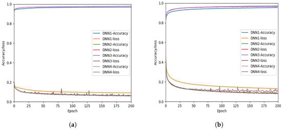 Accuracy loss plots of DDN on Dataset DS1. (a) DNN binary classification; (b) DNN multi-class classification.