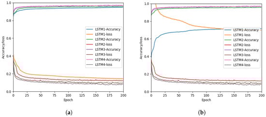 Accuracy loss plots of LSTM on dataset DS1. (a) LSTM binary classification; (b) LSTM multi-class classification.