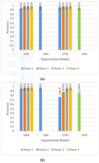 Accuracy comparison of the SVM and DL models used on Dataset DS1. (a) Accuracy comparison of models for binary classification. (b) Accuracy comparison of models for multi-class classification.
