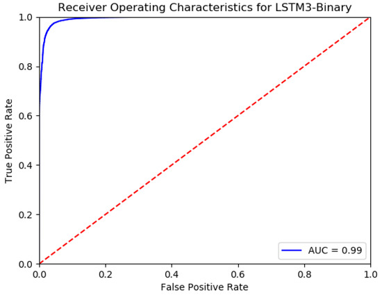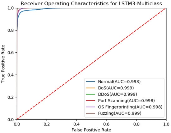 Receiver Operating Characteristic (ROC) for the proposed LSTM model architecture in binary and multiclass classification are shown in Figure 7 and Figure 8 respectively. The proposed approach achieved 0.99 AUC in classifying the network connection records as either attack or normal. In addition, the model has shown 0.993 for Normal, 0.999 for DoS, 0.999 for DDoS, 0.998 for Port Scanning, 0.998 for OS Fingerprinting, and 0.99 for fuzzing in classifying the SDN IoT attacks into different categories. Even in the multiclass category, the proposed method has shown above 0.999 AUC for most of the attack classification. This indicates that the proposed method is robust and can achieve better performances in both binary and multiclass classification. Overall, the Figure 7 and Figure 8 show that the performance is closer to the ideal case, with the graph closer to the reverse “L” shape in both attack detection and attack type classification.