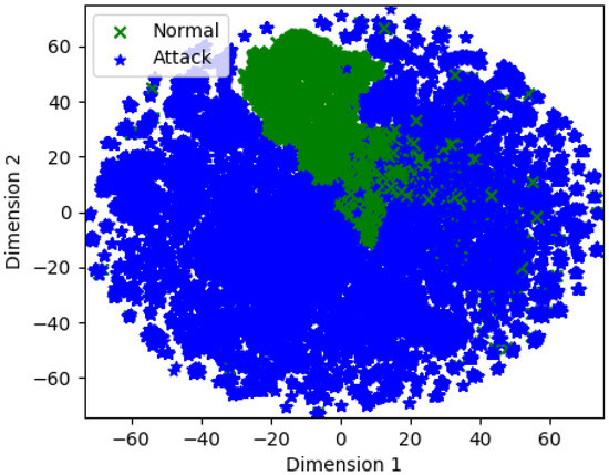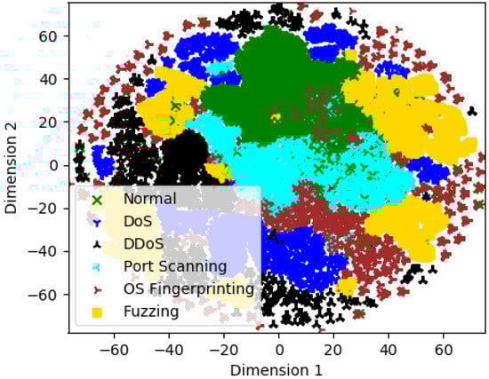 The DL models may contain more than one hidden layer, and interpreting the hidden layers learning ability is challenging. These models act like a black box with minimal information on how the input data is processed to obtain optimal results. t-Distributed Stochastic Neighbor Embedding (t-SNE) is a feature visualization technique used to understand what the DL models learn across different hidden layers. The t-SNE visualization method reduces high-dimensional data into lower dimensions and represents the data in two dimensions, similar to Principal Component Analysis (PCA). We extracted the penultimate layer of the proposed model features for binary and multiclass classification. These were fed into t-SNE to represent two dimensions, and the corresponding plots are shown in Figure 9 for binary and Figure 10 for multiclass classification. Figure 9 indicates that the normal and attack traffic data appeared in different clusters with minimal overlapping. This shows that the model learned the parameters to distinguish the normal traffic or attack traffic. As shown in Figure 10, the attack types formed the clusters to distinguish each other. However, most of the attack types split the clusters into two or more may indicate that the model learns multi patterns of the features for the same attack type.