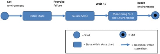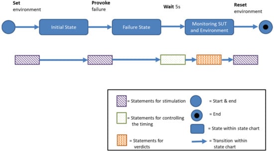 As shown in Figure 1, a test case stimulates three consecutive states in the SUT. First, the test case stimulates the environment [25]. The error is then stimulated, and the SUT is finally observed. This proceeding of states is achieved by executing a sequence of statements. The state-changing statements are attached to the arrows in the figure. In order to check whether the SUT has reached a target state or whether it has waited long enough, statements are listed within the state.