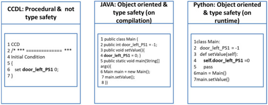 Apart from the two groups of test script languages, the typing, the programming paradigm, and the execution modus have an essential impact on the syntax of a test script language. Examples of the impact of the programming paradigm and type safety are shown for CCDL, JAVA (https://www.java.com/en/, accessed on 5 January 2023) and Python in Figure 3.