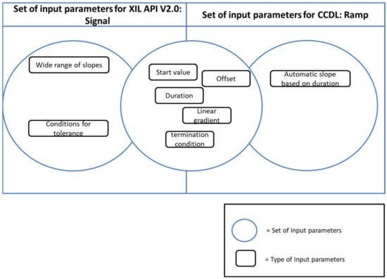 The heterogeneity with respect to the semantics of the function ramp for the test script languages CCDL and ASAM XIL API (https://www.asam.net/standards/detail/xil/older/, accessed on 5 January 2023) is shown in Figure 4 below. In doing so, the figure shows an intersection known from the set theory whereby the set elements are the input parameters of a ramp. These two test script languages were selected as examples because CCDL is primarily used in aviation, and ASAM XIL API is primarily used in automotive applications.