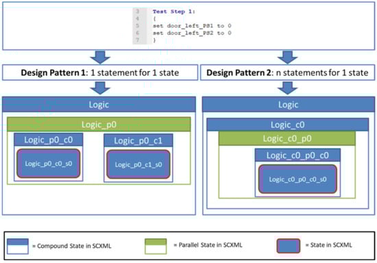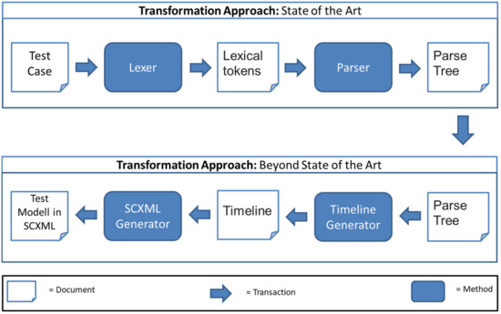 With this, the translation of a test case is similar to source-to-source compiling. While the syntactic processing is based on parse trees, the semantic processing was specifically processed in the direction of a state-based perspective. The translation process from a test case to an SCXML model is shown in Figure 6: