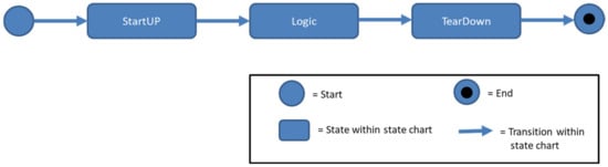 The harmonisation step to achieve interoperability is located in the timeline generator. The timeline generator is specific for a test script language and generates from the parse tree a sequence of statements. Hereby, the statement sequence is a timeline that defines when each statement should be triggered during a test case execution. The timeline does not define how long the statement runs, but rather, it defines whether the statement is blocking or non-blocking. Based on the timeline, the SCXML Generator first creates the overall test case structure (StartUp, Logic, TearDown). This test case structure has been developed as the typical structure for testing aircraft in the research project AGILE-VT [29]. Subsequently, the timeline generator adds all statements chronologically. In doing so, blocking statements are added as actions inside the predefined states. Parallel statements can be added by creating a parallel state which would be the first child of the state logic. The outcome of step 1 is a set of test cases from different test script languages in SCXML and, more precisely, in the last Generic SCXML version.