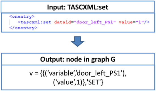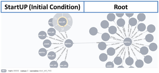 Based on the prerequisites, a snippet has been defined for the first door, which contains TASCXML: set statements for the position sensors and is analogical to the first stimulus contained in the StartUP state of the real Generic SCXML test case. It includes five contains TASCXML: set and a wait statement. The snippet’s content describes the initial state of an ordinary door test case. The intention of the snippet is comparable to the example of the initial condition in Figure 14. The real applied test cases use different signal names, implement more logic and include more TASCXML:set statements for the stimulation of the SUT, but the principle of the stimulation is comparable. In addition, no wildcards have been used in the snippet. Subsequently, the snippet has been searched in the knowledge graph stored in Neo4J. The outcome of a search is a set of results. All the results have the same similarity for each result, the name of the test case and locations inside the test case is given.