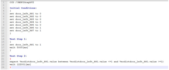 Both definitions introduce the specified test data and the expected results as components of a test case. The test data are fed in various ways and stimulate the SUT. Based on the stimulation, results are expected on how the SUT must behave according to the requirement. The expected results are defined as a condition, and the condition check is implemented using statements of the type of verdict. Examples of verdicts are the statement expect in Check Case Definition Language (CCDL) (https://www.razorcat.com/files/de/produkte/ccdl/Razorcat_Technical_Report_CCDL_Whitepaper_02.pdf, accessed on 5 January 2023) or result in Real-Time Testing (RTT) (https://www.dspace.com/de/gmb/home/products/sw/test_automation_software/automated_test_execution_in_re.cfm, accessed on 5 January 2023).