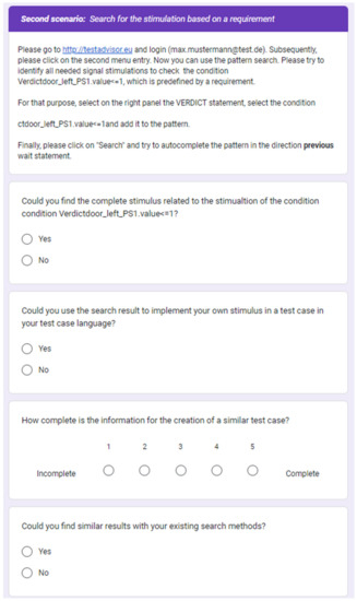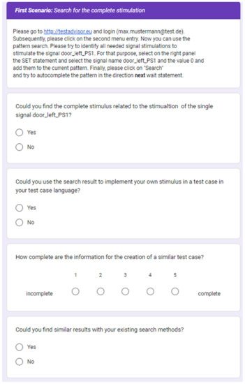 For each scenario, the user needs to use the online version of the demonstrator (https://testadvisor.eu, accessed on 5 January 2023) to try out the search. After a user has executed a scenario, the user must fill out the related questionnaire’s section. With this, the questionnaire explores whether the search scenario is applicable to the developed pattern search and how useful the search results are. For that purpose, the user must answer four questions, namely {Could you find the complete stimulus related to the stimulation of <search query>?, Could you use the search result to implement your own stimulus in a test case in your test case language?, How complete is the information for the creation of a similar test case?, Could you find similar results with your existing search methods?}.