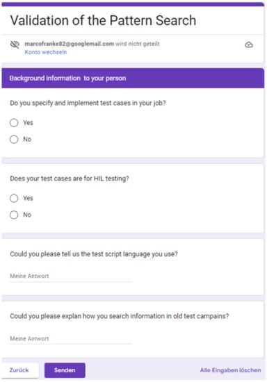 Finally, the user needs to answer whether he is familiar with the creation of test cases for HIL test processes. The questionnaire is online (https://forms.gle/kJkiAFL2mJUVeaCt5, accessed on 5 January 2023) available, and all interested users are welcome to try out the application scenarios and fill out the questionnaire. In the scope of the linked research projects and corresponding target audience, this type of evaluation has not been performed, and it is no longer feasible. This means that there are no validation results available. To reach a validation, the goal is to perform an open validation based on the two application scenarios using the example data and an ongoing evaluation by the questionnaire. The questionnaire is shown as screenshots in Figure 19, Figure 20 and Figure 21.