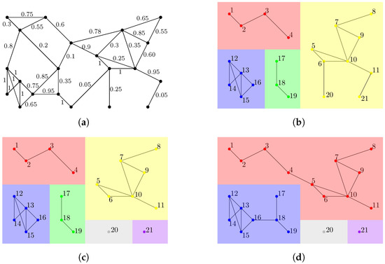 Random connection graph and three possible realizations and cluster formations. We show each cluster with a different color. (a) Probabilities of the edges; (b) a realization of with four clusters; (c) a realization of with six clusters; (d) a realization of with four clusters.