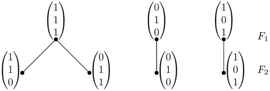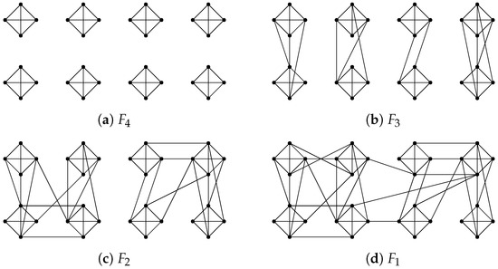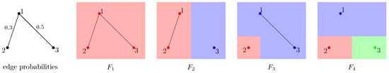 By definition, the main diagonal of the random connection matrix is zero, since we define edges between distinct vertices only. In this example, consists of four possible cluster formations, and thus we have . The random cluster formation variable F can take those four possible cluster formations with the following probabilities: