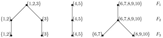 The graph model and the resulting cluster formations we described so far are general. For tractability, in this paper, we investigate a specific class of which satisfies the following condition: For all i, can only be obtained by partitioning some elements of . This assumption results in a tree-like structure for cluster formations. Thus, we call sets that satisfy this condition cluster formation trees. Formally, is a cluster formation tree if can be obtained by partitioning the elements of for all . Note that in (2) is not a cluster formation tree. However, if the probability of the edge between vertices 1 and 3 were 0, then would not contain and , and would be a cluster formation tree in this case. Note that cluster formation trees may arise in real-life clustering scenarios, for instance, if individuals belong to a hierarchical structure. An example is: an individual may belong to a professor’s lab, then to a department, then to a building, and then to a campus.