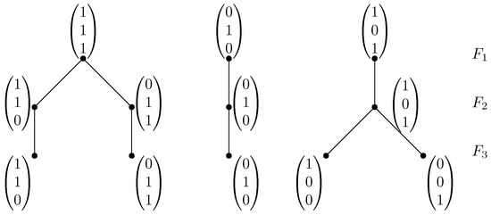 Note that, for all elements of , the corresponding result vector is unique and satisfies the tree structure criteria, as shown in Figure 4. - If (i.e., ): In this case, the set of all possible infected sets is . We give a tree structure representation with assigned result vectors of length 3 that achieves the tree structure criteria discussed above, which is shown in Figure 5 where each unique node is assigned a unique vector except for the nodes that do not become partitioned while moving from level to level. Note that every unique node in the tree representation corresponds to a unique element of . The corresponding test matrix is the following matrix: