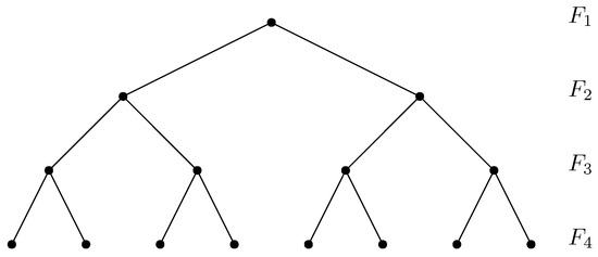 First, we find the optimal sampling functions, M, for all possible selections of . First of all, note that M selects exactly one individual from each subset that forms , by definition. Therefore, the number of sampled individuals is constant for a fixed choice of . Thus, in the optimal sampling function design, the only parameter that we consider is the minimum number of expected false classifications . Note that a false classification occurs only when one of the sampled individuals has a different infection status than one of the individuals in its cluster in . For instance, assume that is chosen. Then, assume that the sampling function M selects individual 1 from the set . Recall that, after the second step of the two-step group testing algorithm, by using , the infection status of individual 1 is identified with zero-error and its status is used to estimate the statuses of individuals 2 and 3, since they are in the same cluster in . However, with positive probability, individuals 1 and 3 can have distinct infection statuses, in which case, a false classification occurs. Note that this scenario occurs only when is at a higher level than the realized F in the cluster formation tree , where we refer to as the top level of the cluster formation tree and as the bottom level.