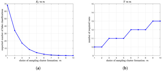 For instance, in (38) is composed of four clusters with , , and . When is chosen as the sampling cluster formation, the resulting expected number of false classifications is , and the required number of tests is 3, as seen in Figure 9a,b. For the sampling cluster formation choices which are not one of the six cluster formations listed above, these six cluster formations can be chosen to minimize the expected number of false classifications while keeping the required number of tests constant. For instance, all choices of m between and result in the required number of three tests as but yield a larger than what yields.