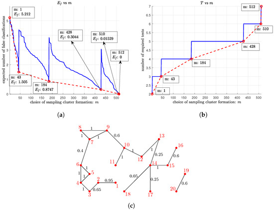 Since the system here is arbitrary unlike the exponentially split cluster formation tree structure in the first simulation environment in Section 7.1, the resulting expected number of false classifications is not monotonically decreasing when we sort the resulting required number of tests in the increasing order for the choices of . In Figure 9a, we mark the choices of sampling cluster formations that result in the minimum number of expected false classifications within each required number of the test range. By using time sharing between these choices of the sampling cluster formations, dotted red lines between them can be achieved. The six corner points in Figure 9a,b correspond to the following cluster formations,