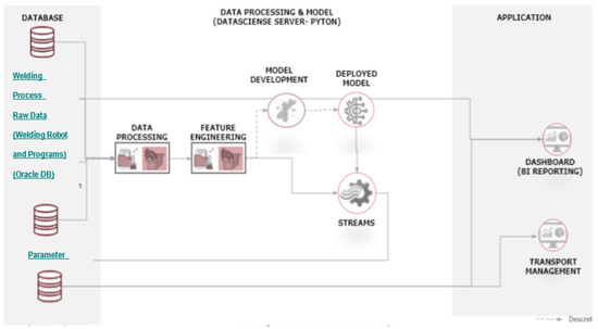 In the digitalization of production lines, manufacturing companies are strongly oriented toward minimizing defects in production processes by adopting intelligent solutions enabled by digital tools. In this context, data connectivity, predictive analytics using machine learning models, intelligent manufacturing systems, and big data solutions act as primary tools to improve production efficiency and profitability. In particular, intelligent control systems, which include learning process and pattern recognition algorithms, offer opportunities to detect rare quality defects in the automotive industry, acting as a leader and first adopter of smart manufacturing worldwide [1,2]. Artificial intelligence and machine learning (ML) techniques for process simulation are enablers of “Time to Market” and “Do It Right the First Time” expectations in the automotive industry [3]. Hence, the quality of the welding process urgently needs to be improved to enable higher resource efficiency and cost reduction [4]. In practice, weld quality checks are usually conducted at the end of a welding operation. Hence, welding defects can only be identified after the welding is completed, causing delays in defect identification and necessitating reworks and excessive material usage, which hinder sustainable production [5].