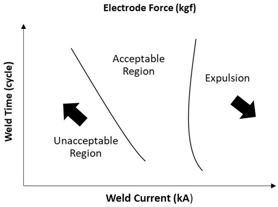 In the welding process, weld current, weld resistance, weld time, surface coating, electrode force, hold time, and welding voltage have severe effects on each other. Figure 3 shows an example of the appropriate welding range for a welding lobe due to the evaluation of parameters such as welding time and welding current, as adapted from Hwang et al. [6].