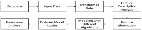 The material used in this study was welding robot data and process information from the studied automotive production line. Figure 4 shows the analytical process including the data collection, feature elimination, classification modeling via learning algorithms, and evaluation of model results.