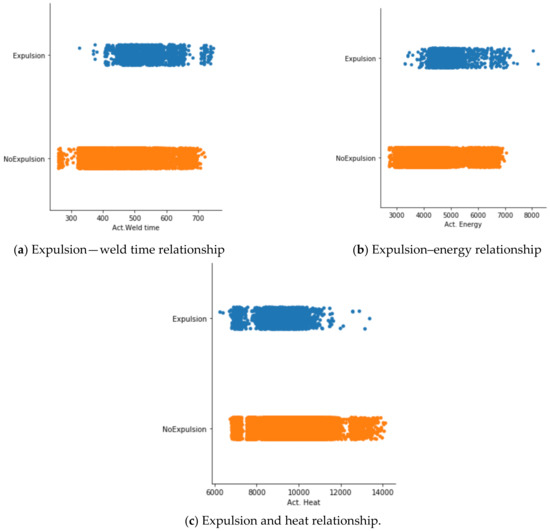 Regarding the selected variables in Table 4, there were no null or missing values in the process database. However, some negative values for the “Time Diff.” variable were identified, possibly due to measurement errors. The process data also revealed an “energy” loss due to expulsion, negatively affecting the machine efficiency. “Volt” values had a very narrow range due to the regulator used in the welding machines, ensuring the efficiency of the equipment. The “Current” value, which depends on volts and resistance, had a narrow range as it was calculated by the spot point (material properties) and the volt. The “Weld Time” variable had a very wide range and was a critical parameter. The chart below (Figure 6a,b) shows that the process that normally takes place with a lower weld time, which takes a longer time when expulsion occurs. The measured “Energy“ and “Heat” values also had wide ranges, in which more energy was consumed than in the normal process in the case of expulsion, but the amount of heat measured was lower because of the loss of heat due to the expulsion.