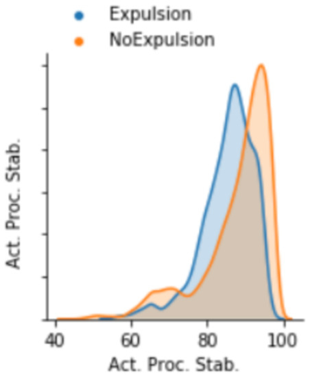 The “Resistance” variable, which is one of the most important variables, was fixed to a narrow range because it depended on the material. Our main purpose in expulsion calculation was to detect sudden changes in resistance. The “Proc. Stabler.” variable varied between 44 and 99 variables. The Figure 7 is tilted to the left (negative) for the “expulsion (blue)” and “no-expulsion (orange)” values.