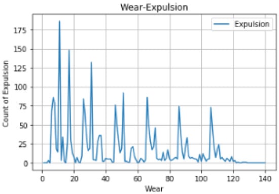 As the wear–expulsion graphic (Figure 8) shows, expulsion was generally seen in the first wear points. To solve this problem, the parameters in the programs may need to be optimized. The graph shows that spot-welding-related problems can exist in the wear variable. After discussions with the production line supervisors in the company, and based on the literature research, the wear variable was labeled as “ineffective”.