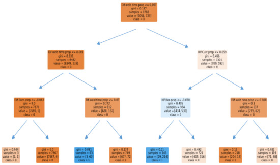 The significance level of the selected model variables was examined using TN and TP values. The significance levels of these variables were proportional to the Gini scores calculated in Equation (5). The variable which decreased the entropy most—“Dif.Weld time.prop” (difference ratio between actual and reference weld time value)—was considered most powerful feature over the model and was the independent variable explaining the dependent variable most. Therefore, it was used in the root-cause analysis of the expulsion-related problem.